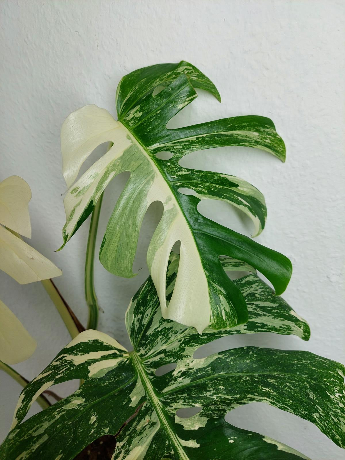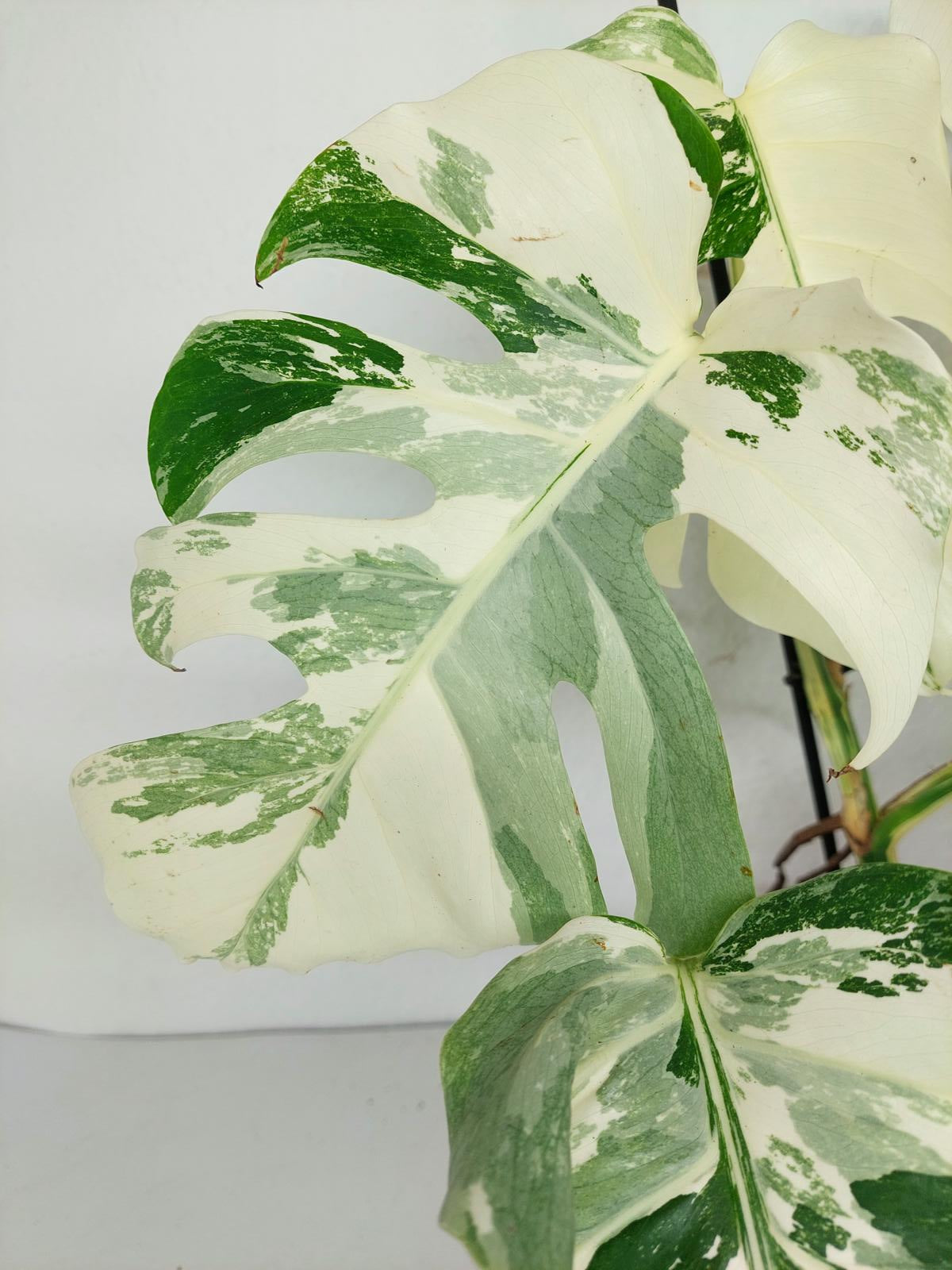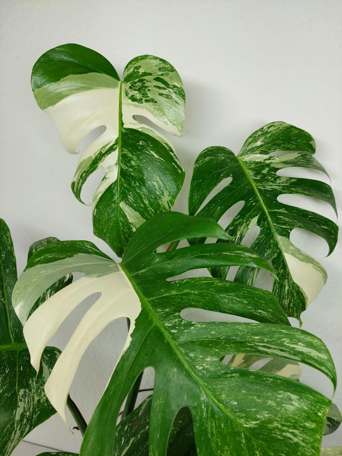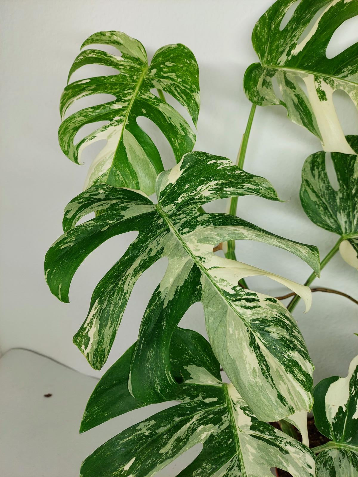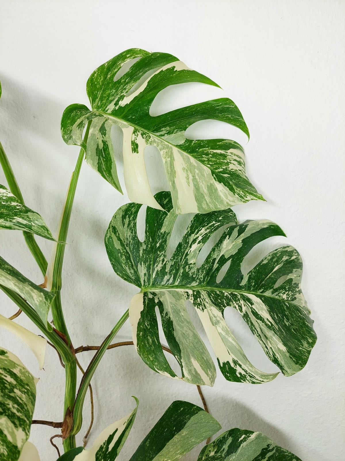 Diese einzigartige Zimmerpflanze ist ein echter Blickfang mit ihrem atemberaubenden Blattmuster. Jedes grüne Blatt ist kunstvoll mit weißer Variegation verziert, was der Pflanze einen ganz besonderen Charme verleiht. Es handelt sich um die Monstera Borsigiana.