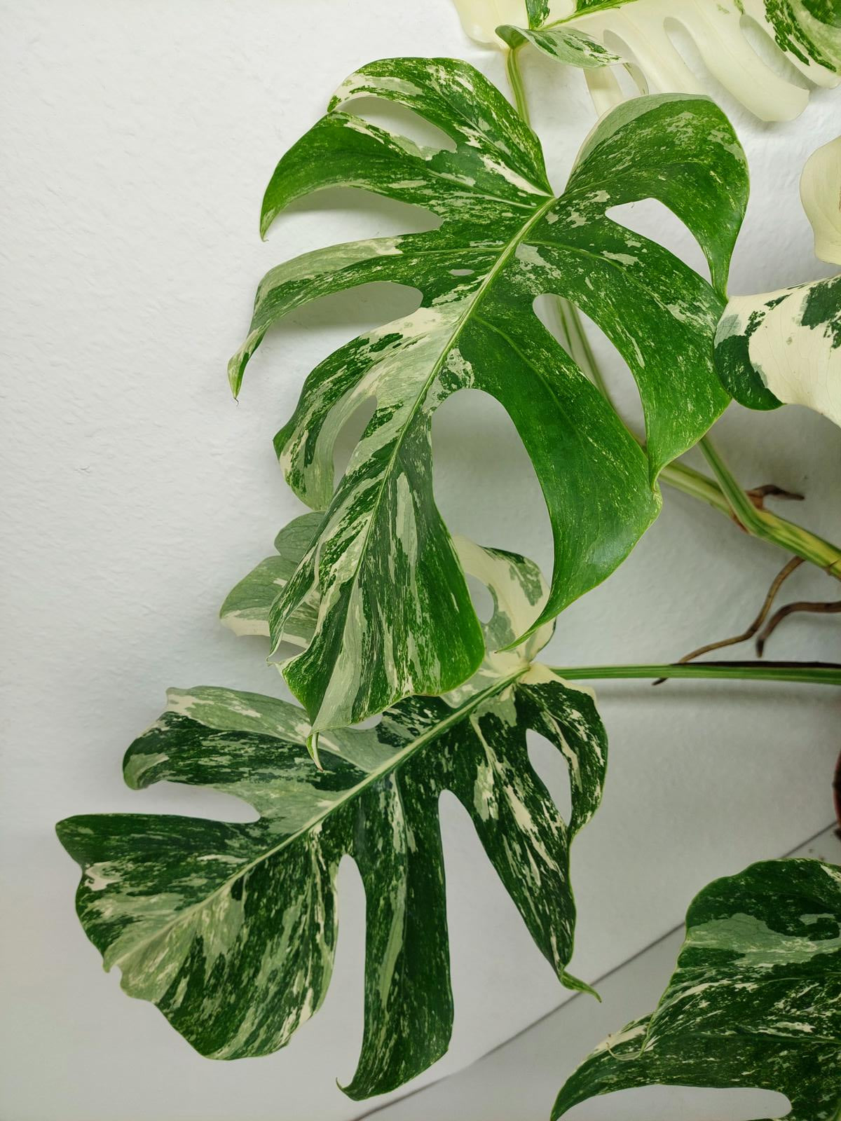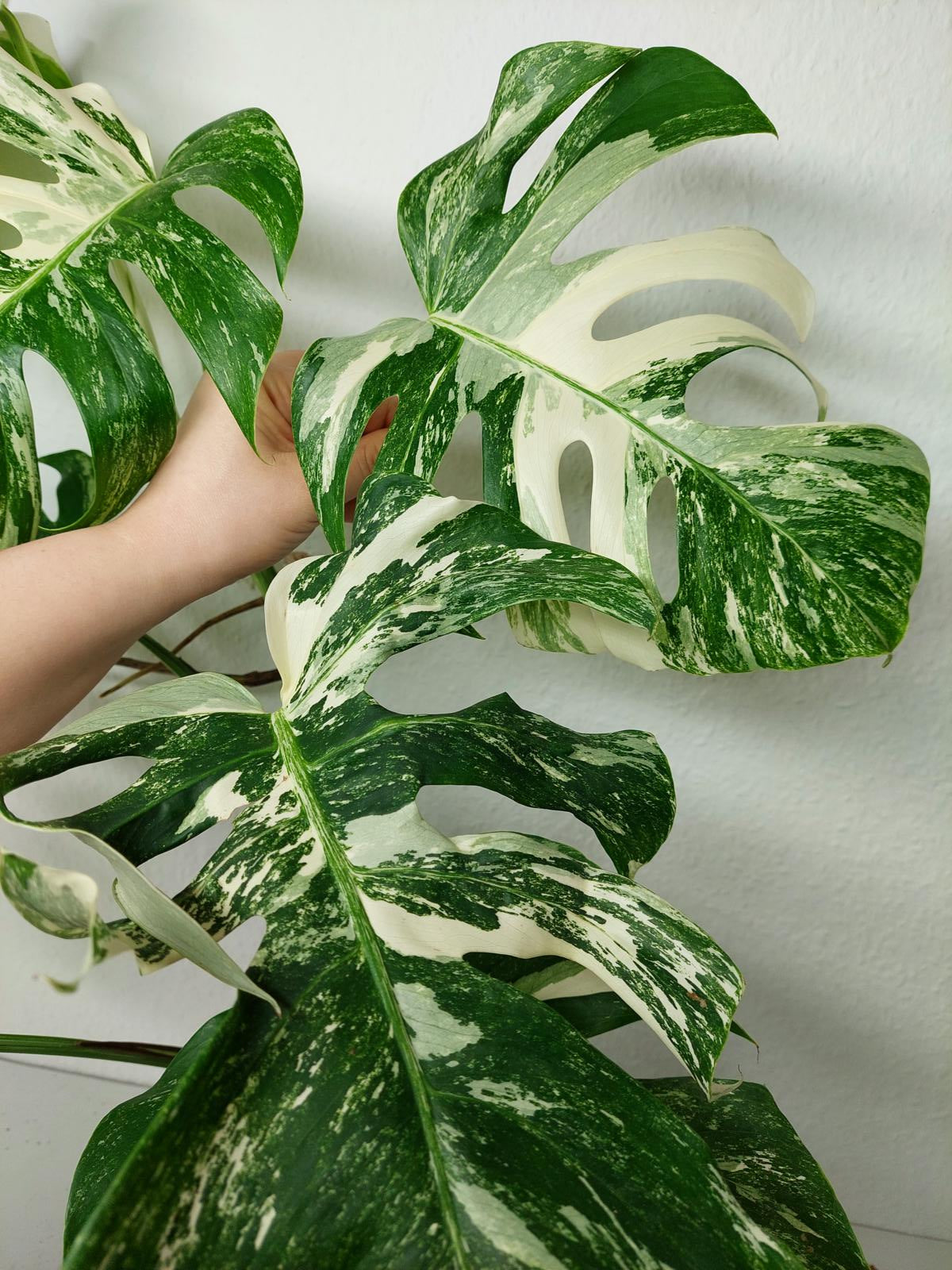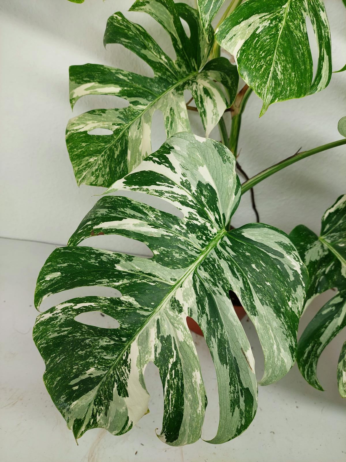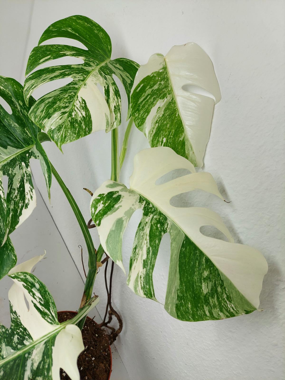 Diese einzigartige Zimmerpflanze ist ein echter Blickfang mit ihrem atemberaubenden Blattmuster. Jedes grüne Blatt ist kunstvoll mit weißer Variegation verziert, was der Pflanze einen ganz besonderen Charme verleiht. Es handelt sich um die Monstera Borsigiana.