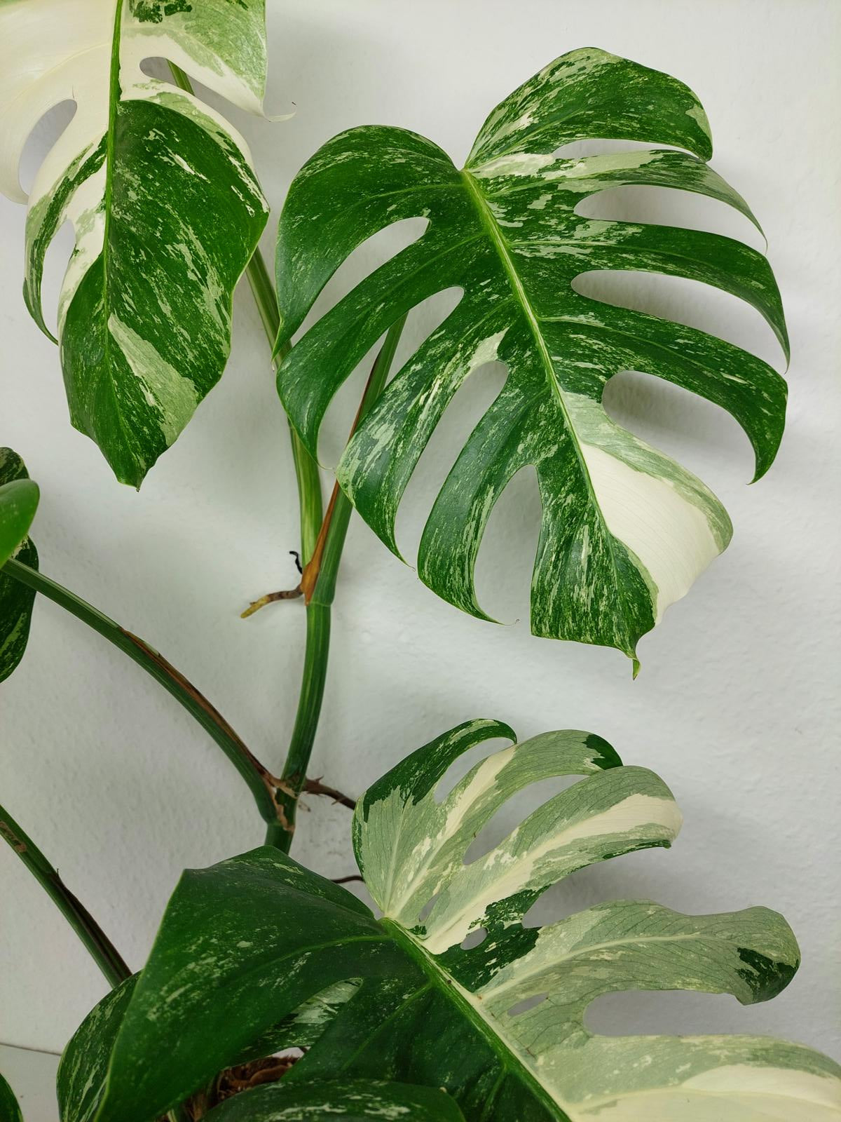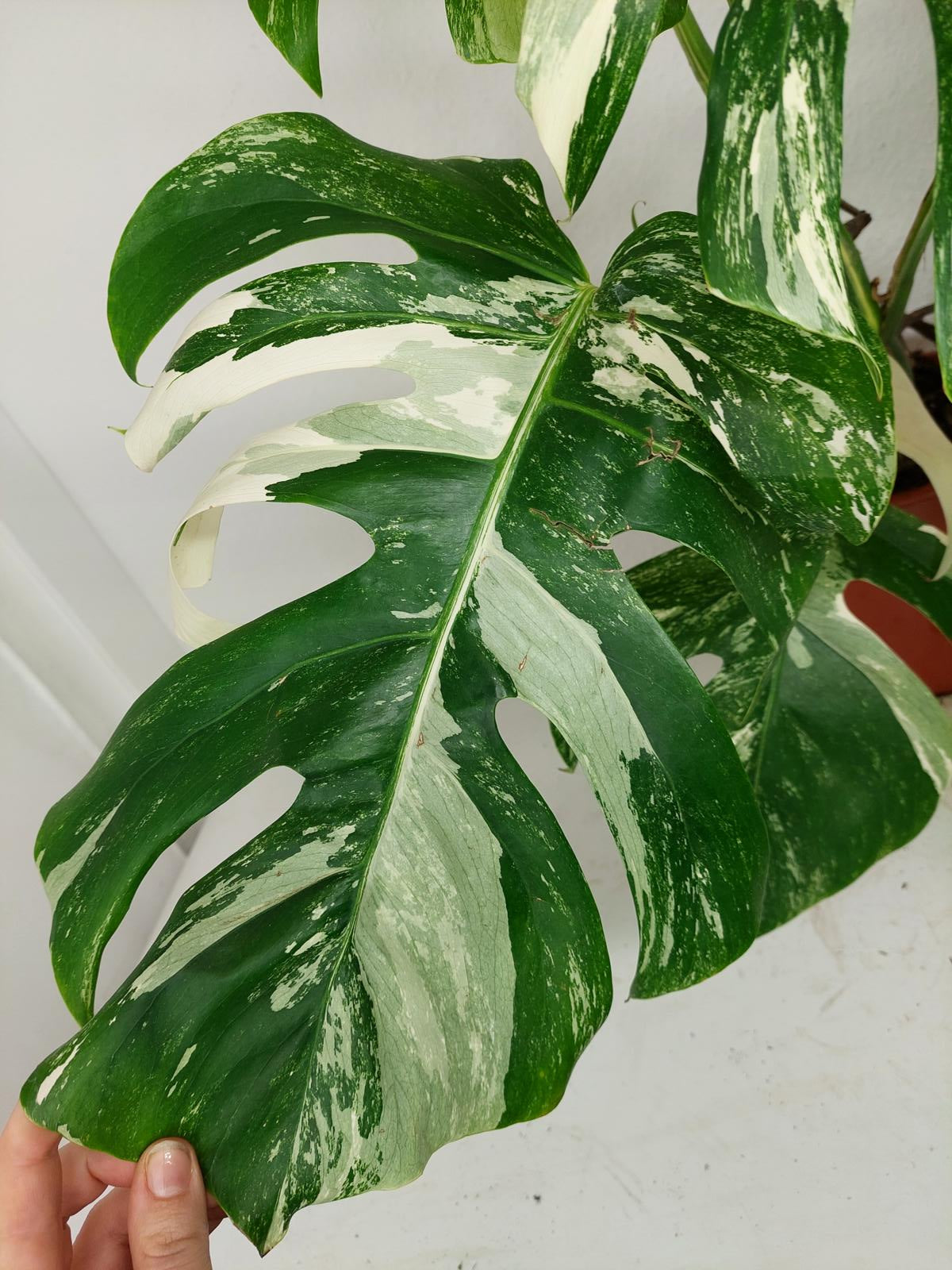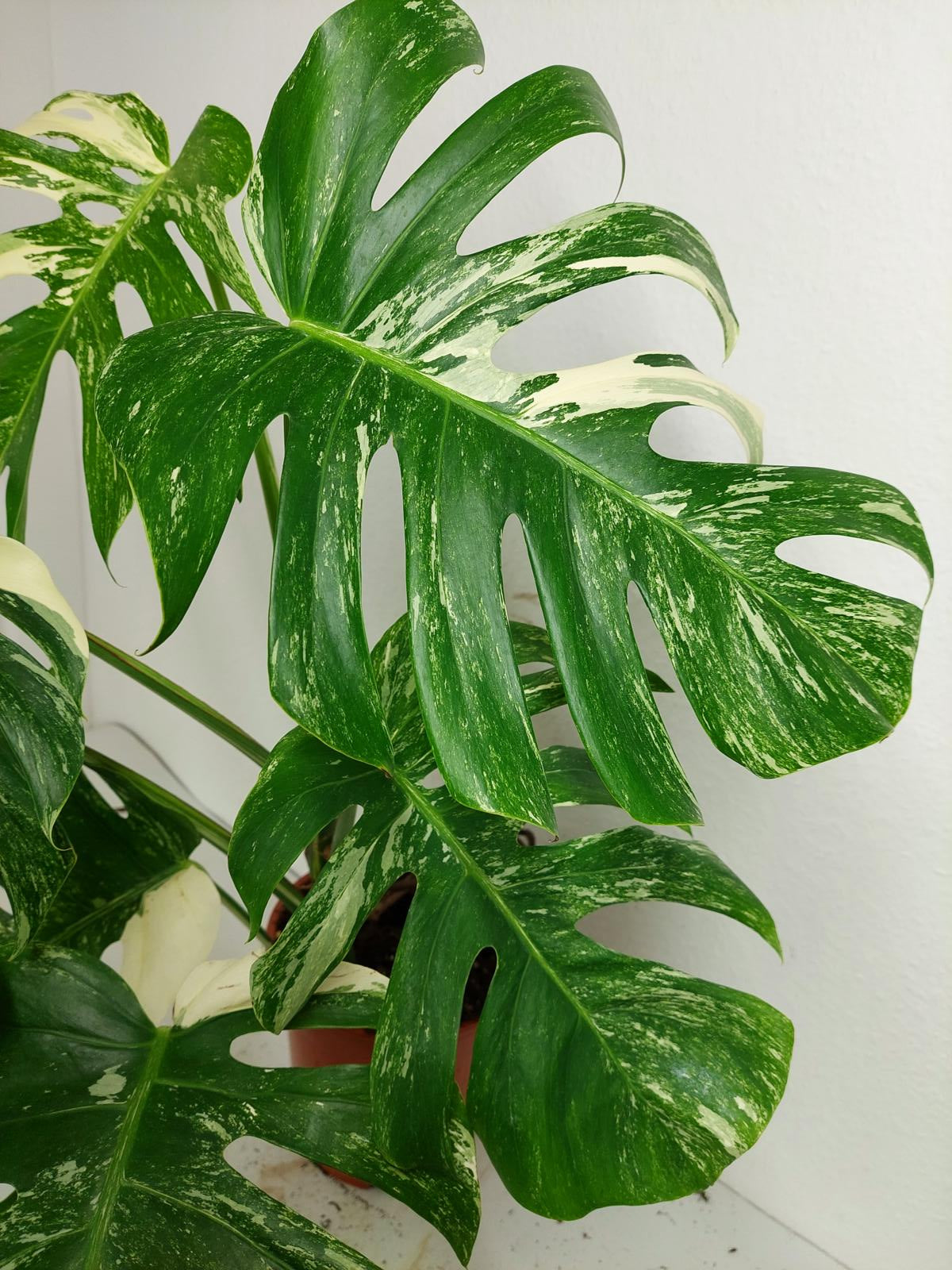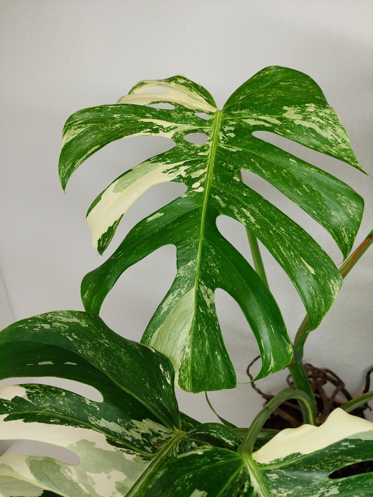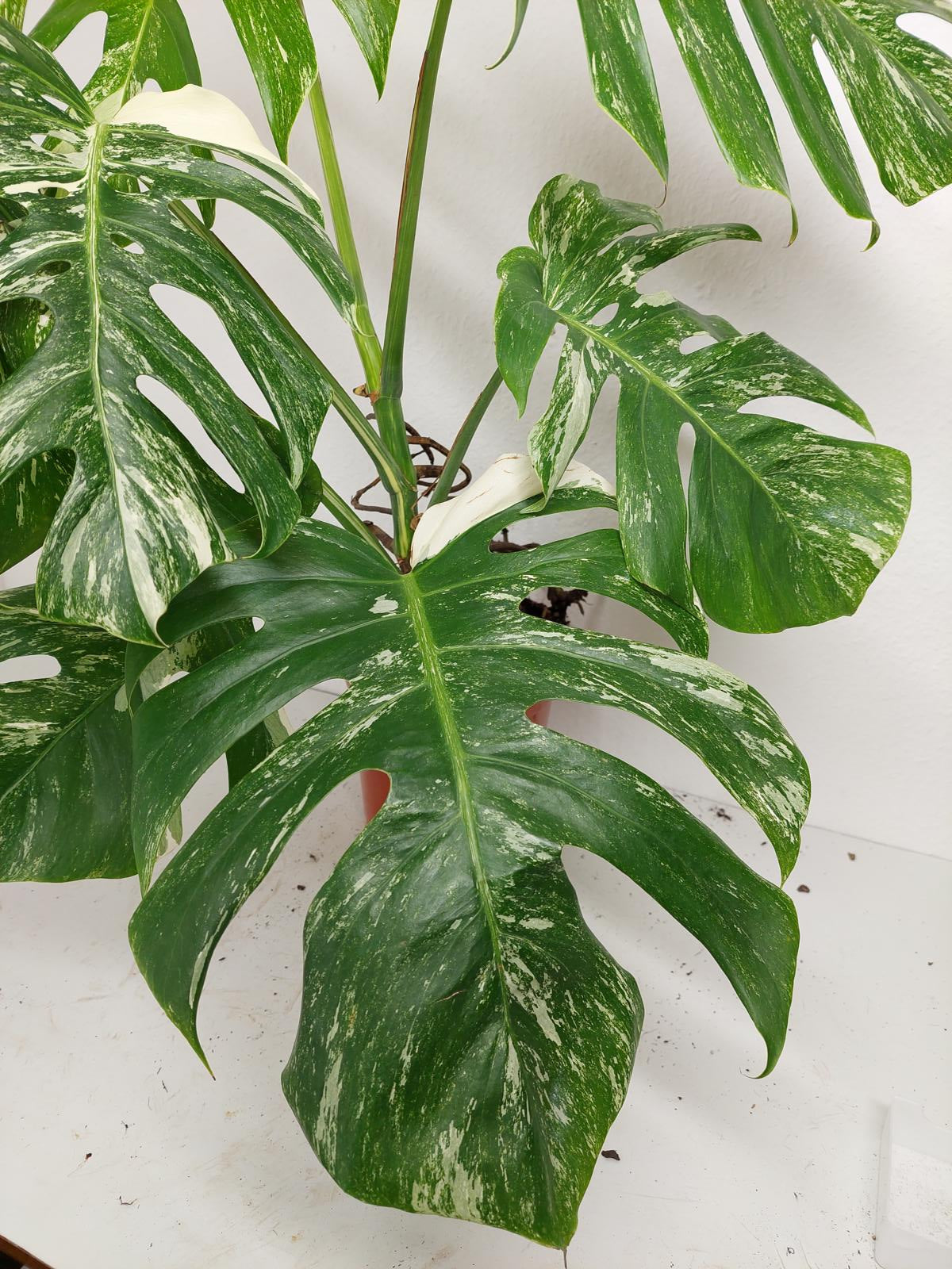 Diese einzigartige Zimmerpflanze ist ein echter Blickfang mit ihrem atemberaubenden Blattmuster. Jedes grüne Blatt ist kunstvoll mit weißer Variegation verziert, was der Pflanze einen ganz besonderen Charme verleiht. Es handelt sich um die Monstera Borsigiana.