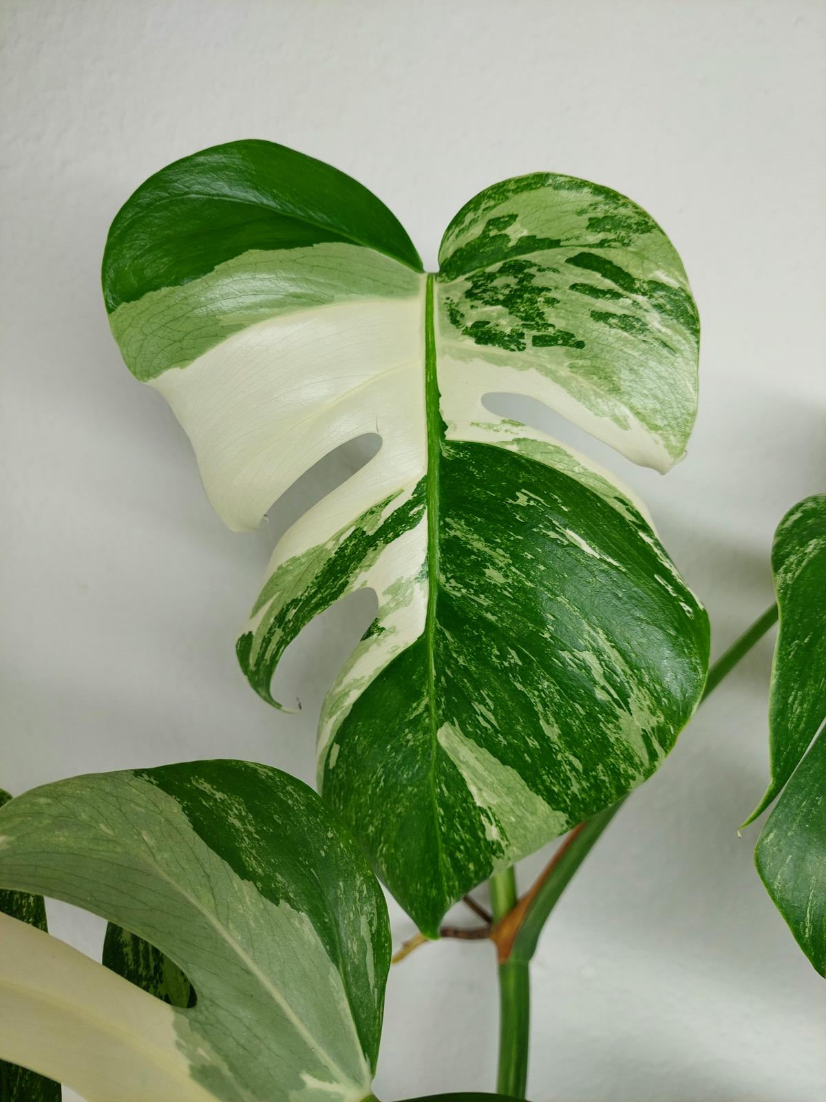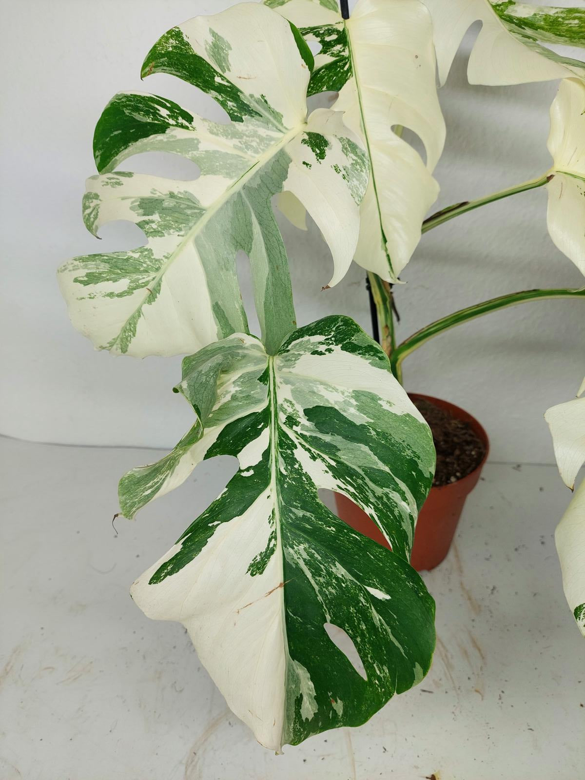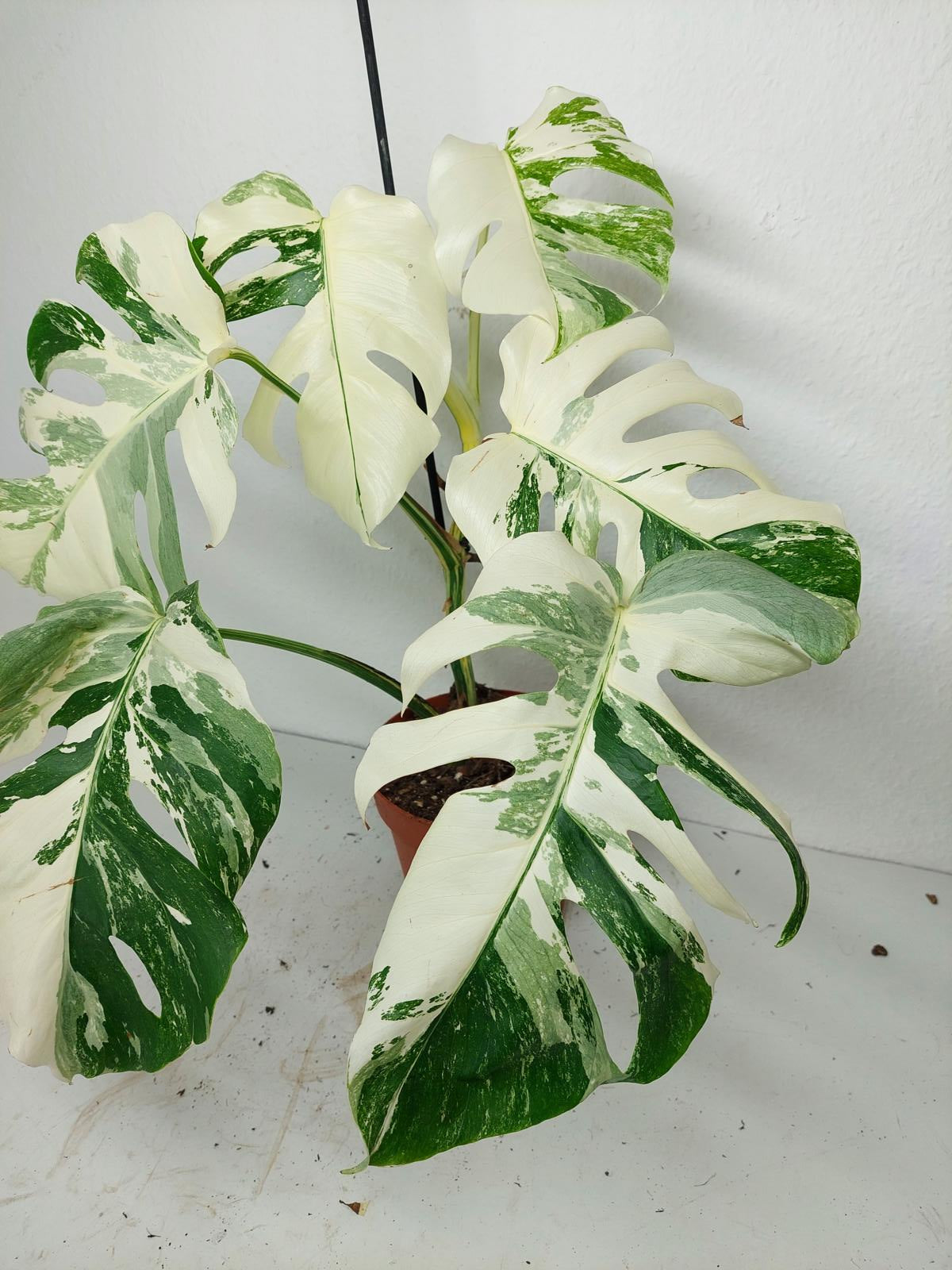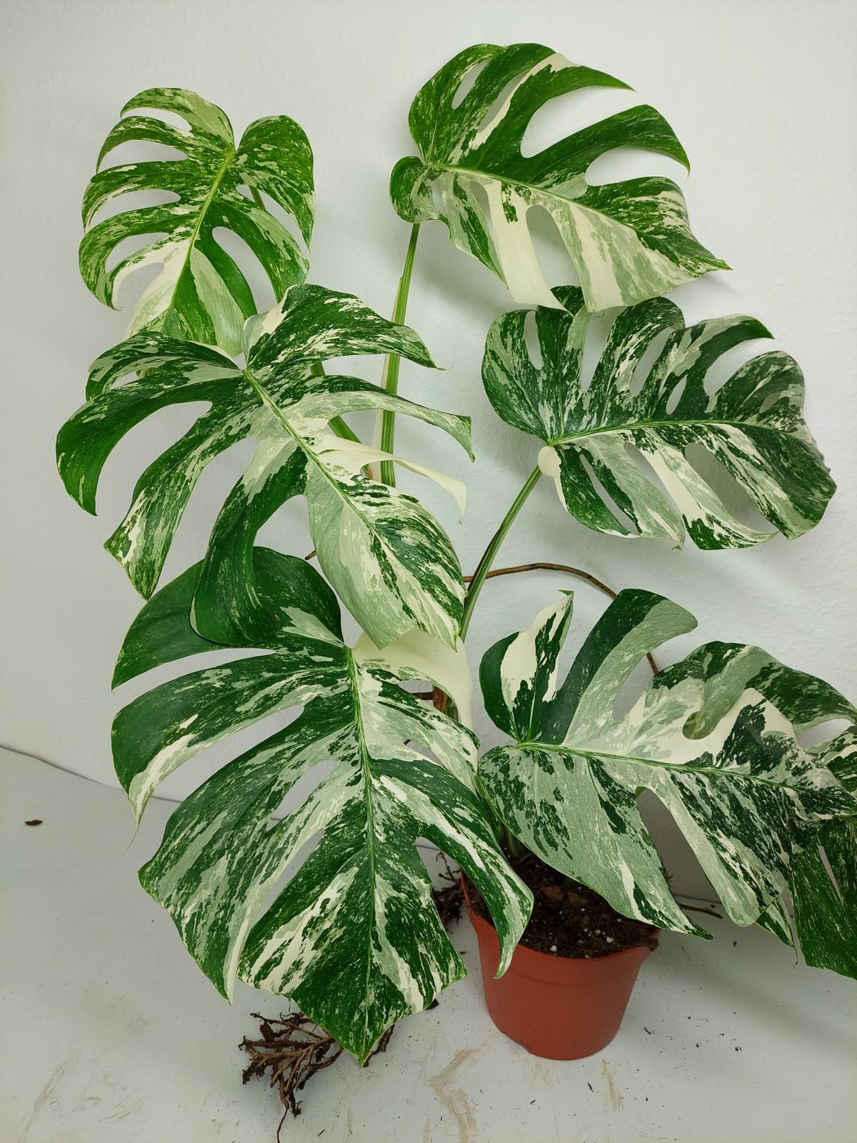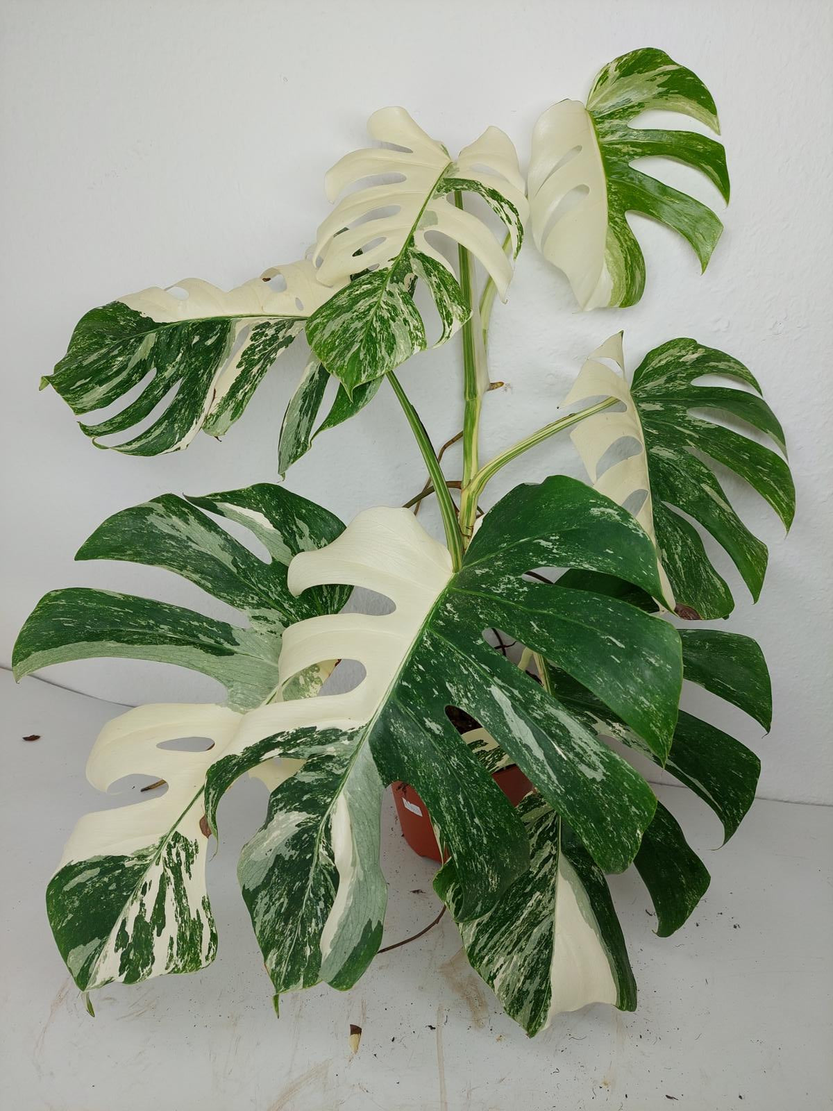 Diese einzigartige Zimmerpflanze ist ein echter Blickfang mit ihrem atemberaubenden Blattmuster. Jedes grüne Blatt ist kunstvoll mit weißer Variegation verziert, was der Pflanze einen ganz besonderen Charme verleiht. Es handelt sich um die Monstera Borsigiana.
