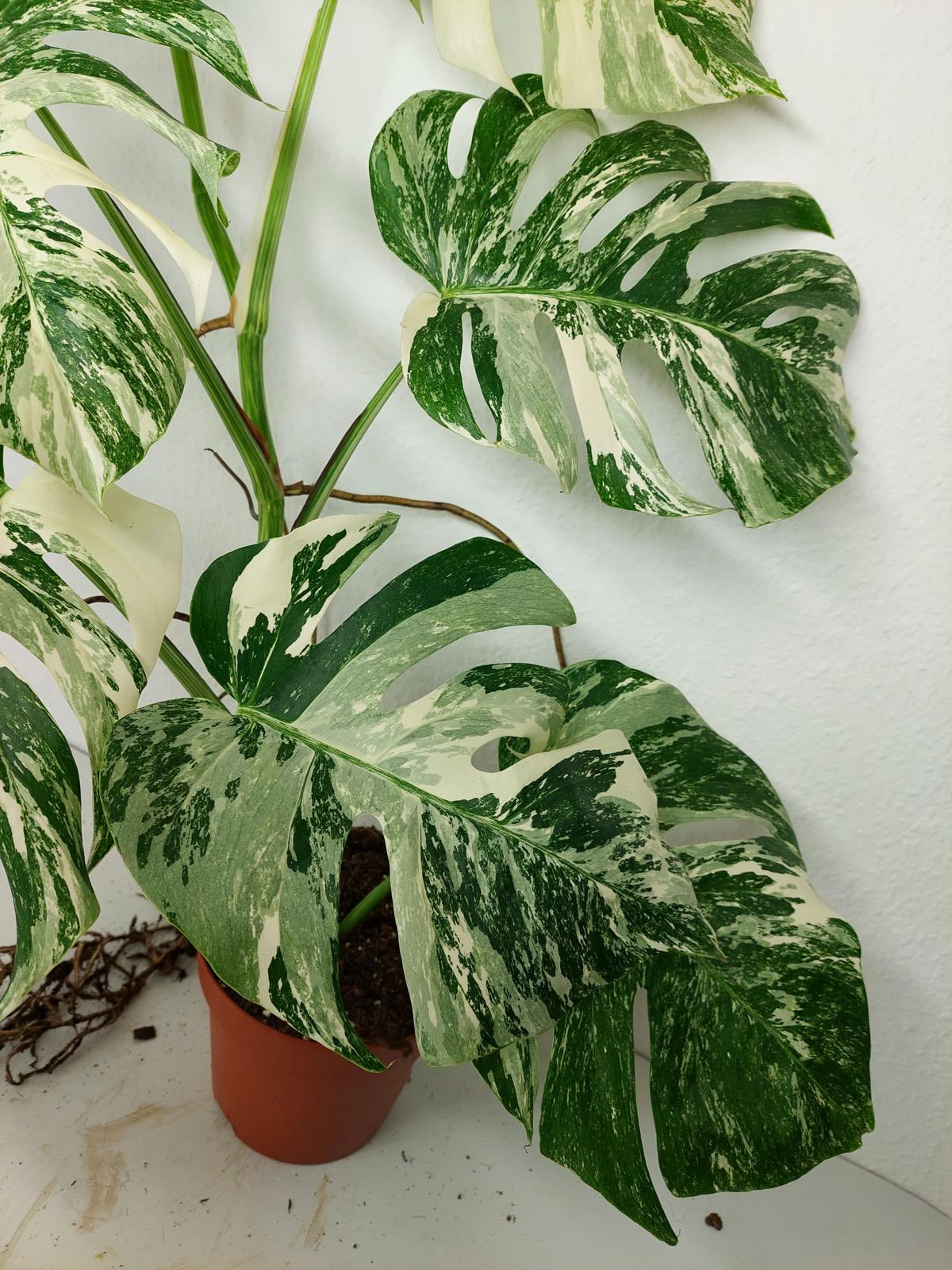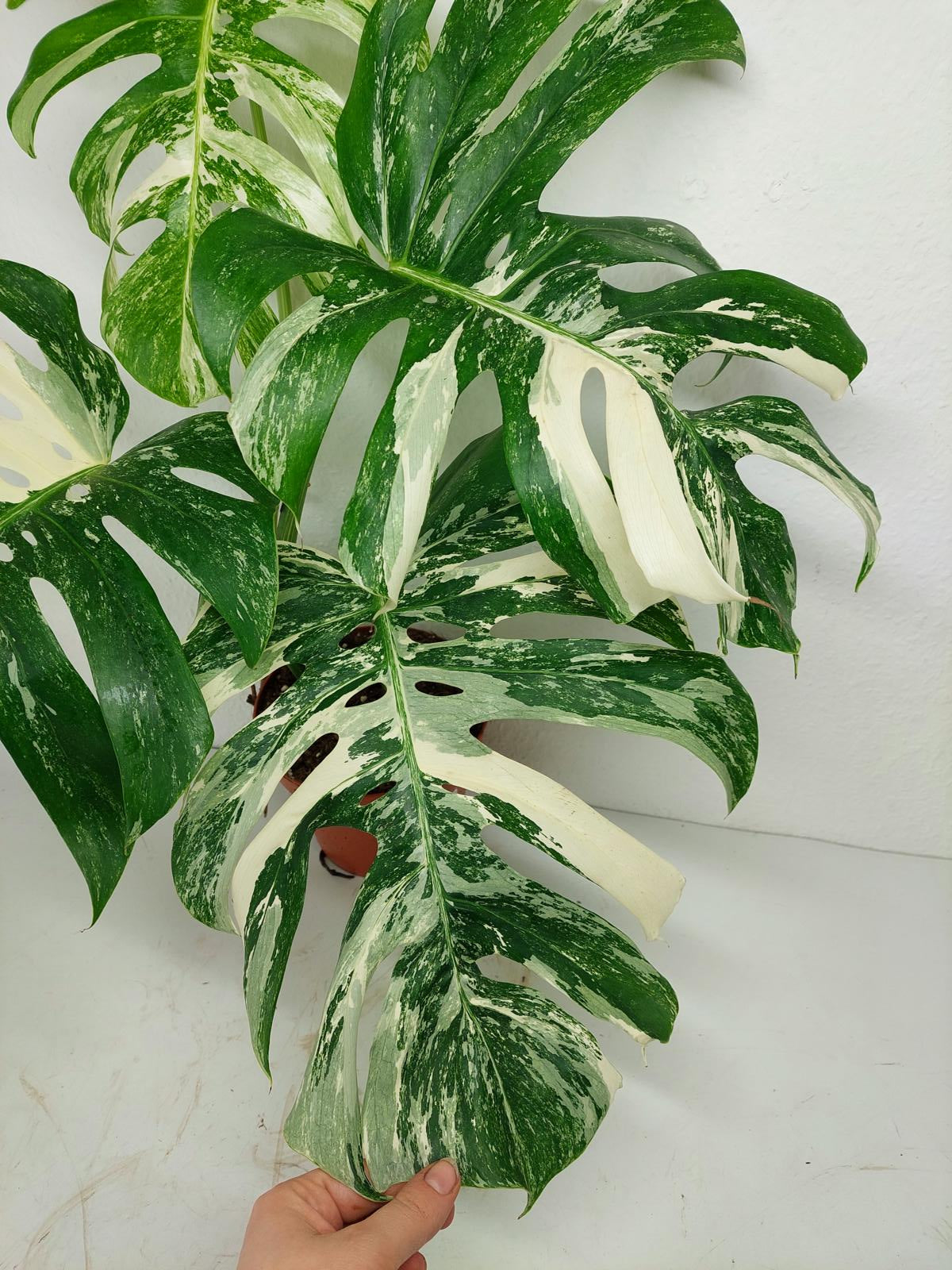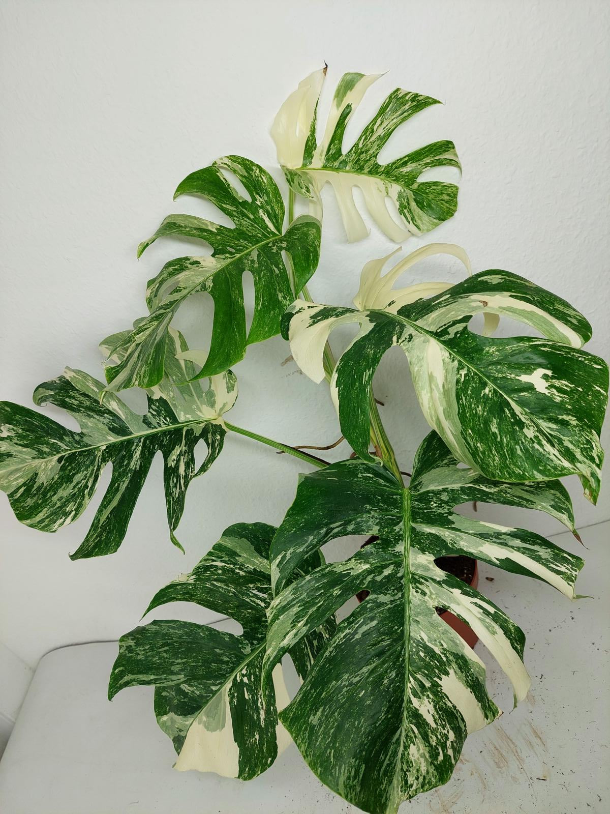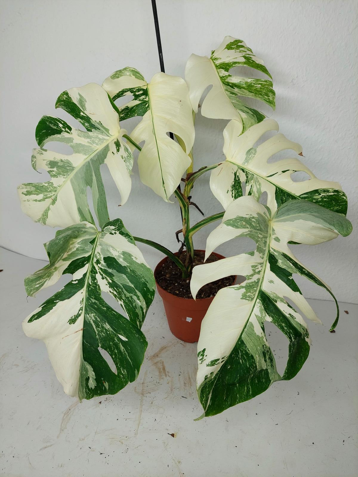 Diese einzigartige Zimmerpflanze ist ein echter Blickfang mit ihrem atemberaubenden Blattmuster. Jedes grüne Blatt ist kunstvoll mit weißer Variegation verziert, was der Pflanze einen ganz besonderen Charme verleiht. Es handelt sich um die Monstera Borsigiana.