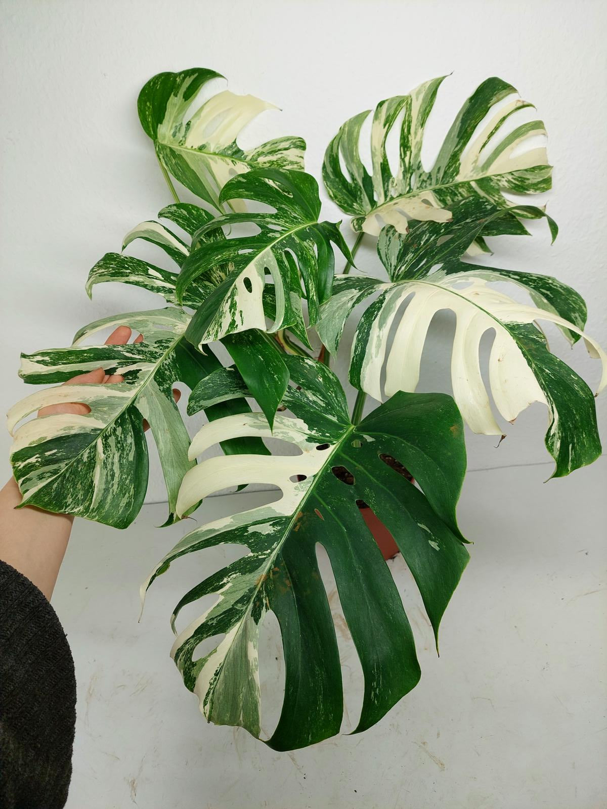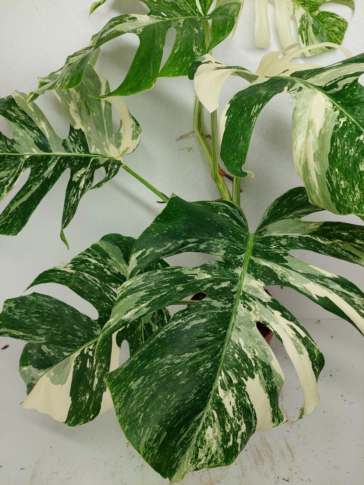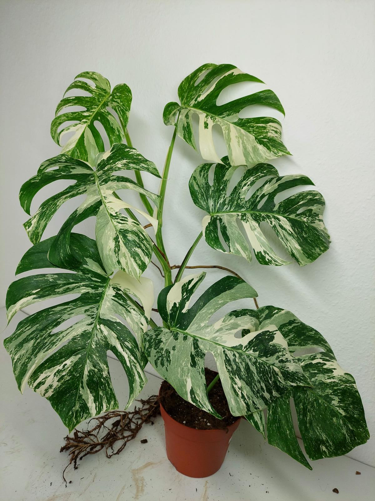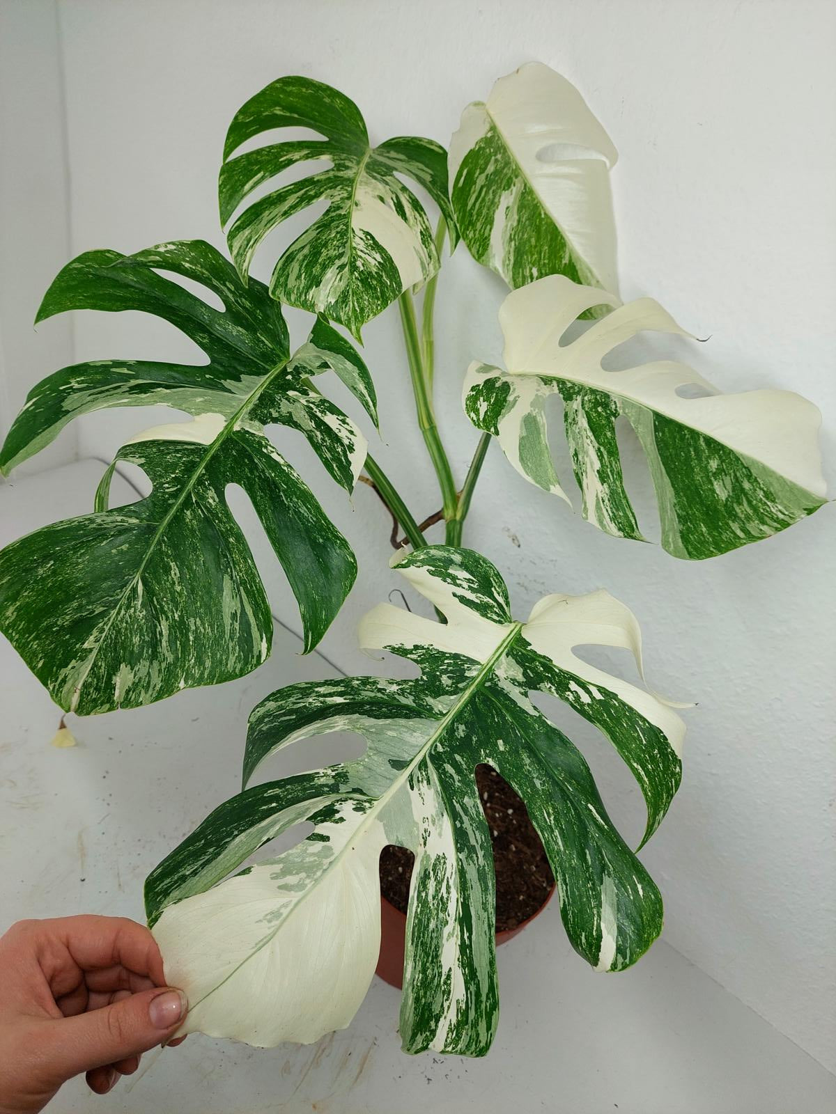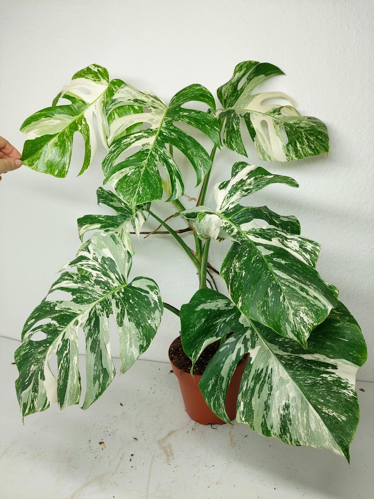 Diese einzigartige Zimmerpflanze ist ein echter Blickfang mit ihrem atemberaubenden Blattmuster. Jedes grüne Blatt ist kunstvoll mit weißer Variegation verziert, was der Pflanze einen ganz besonderen Charme verleiht. Es handelt sich um die Monstera Borsigiana.