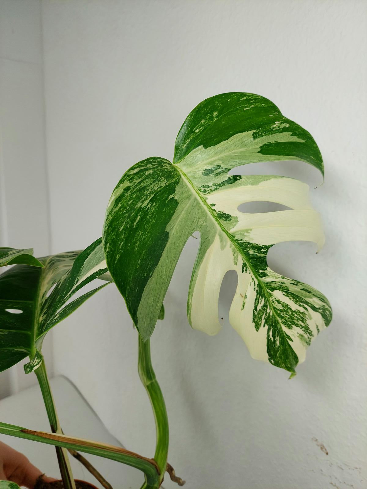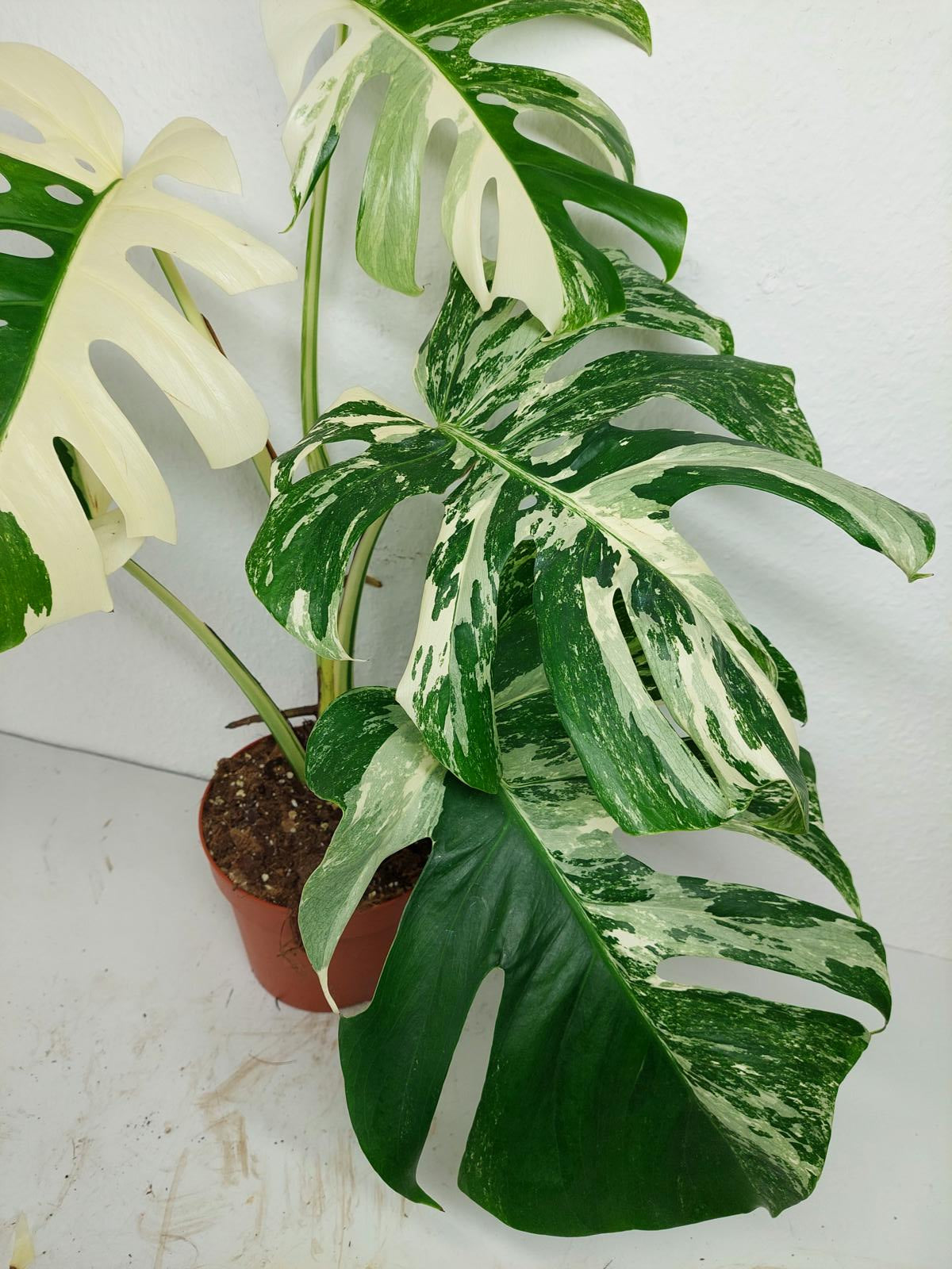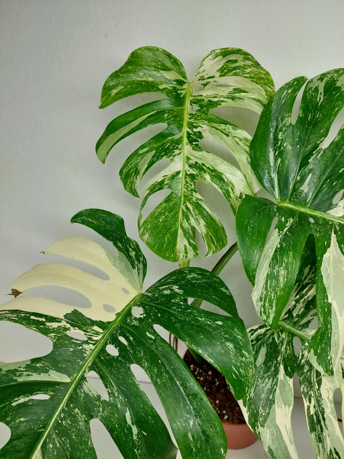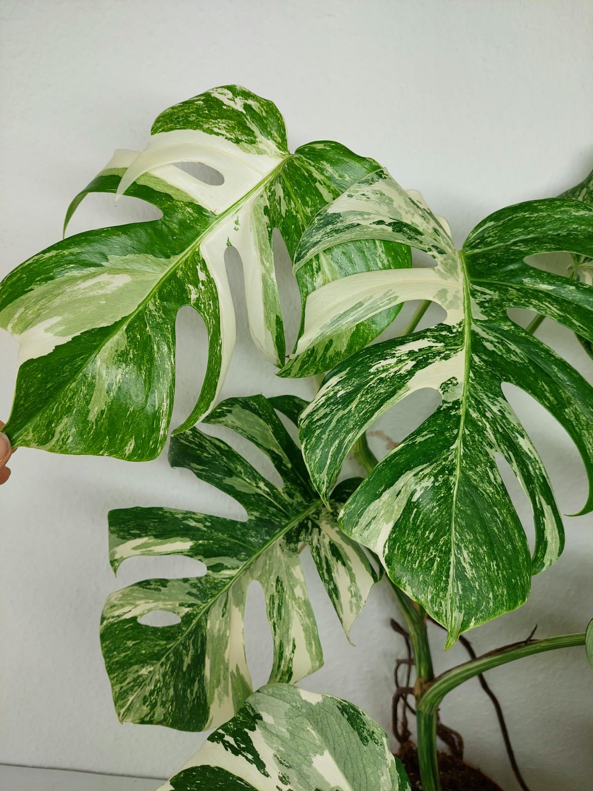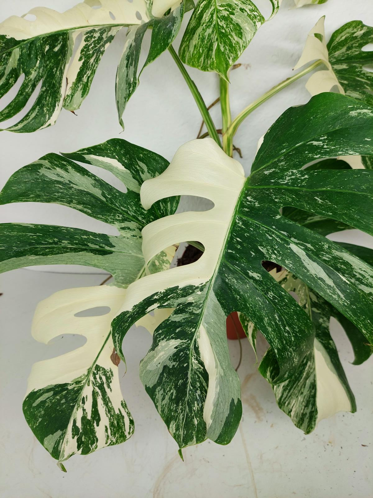 Diese einzigartige Zimmerpflanze ist ein echter Blickfang mit ihrem atemberaubenden Blattmuster. Jedes grüne Blatt ist kunstvoll mit weißer Variegation verziert, was der Pflanze einen ganz besonderen Charme verleiht. Es handelt sich um die Monstera Borsigiana.