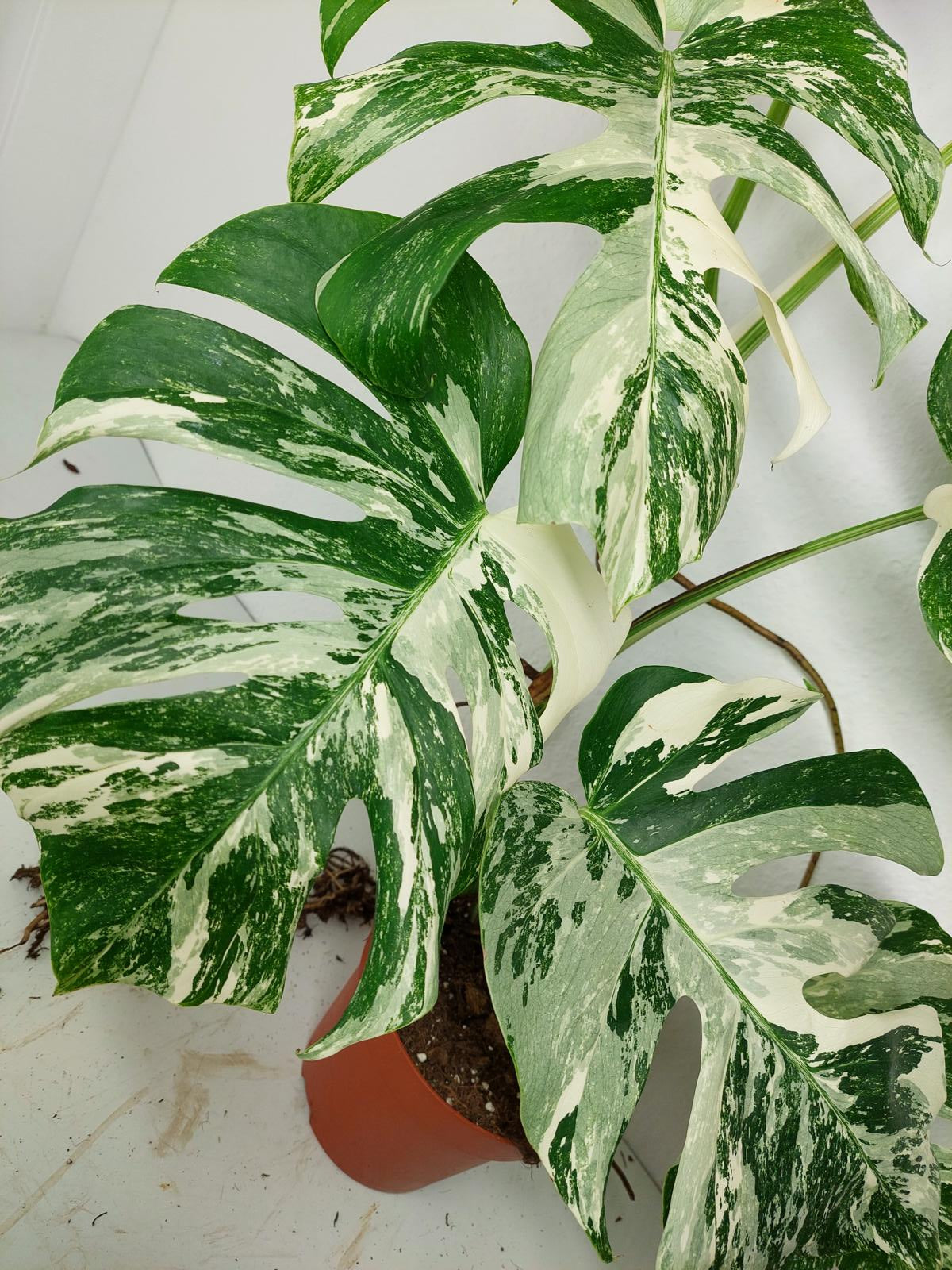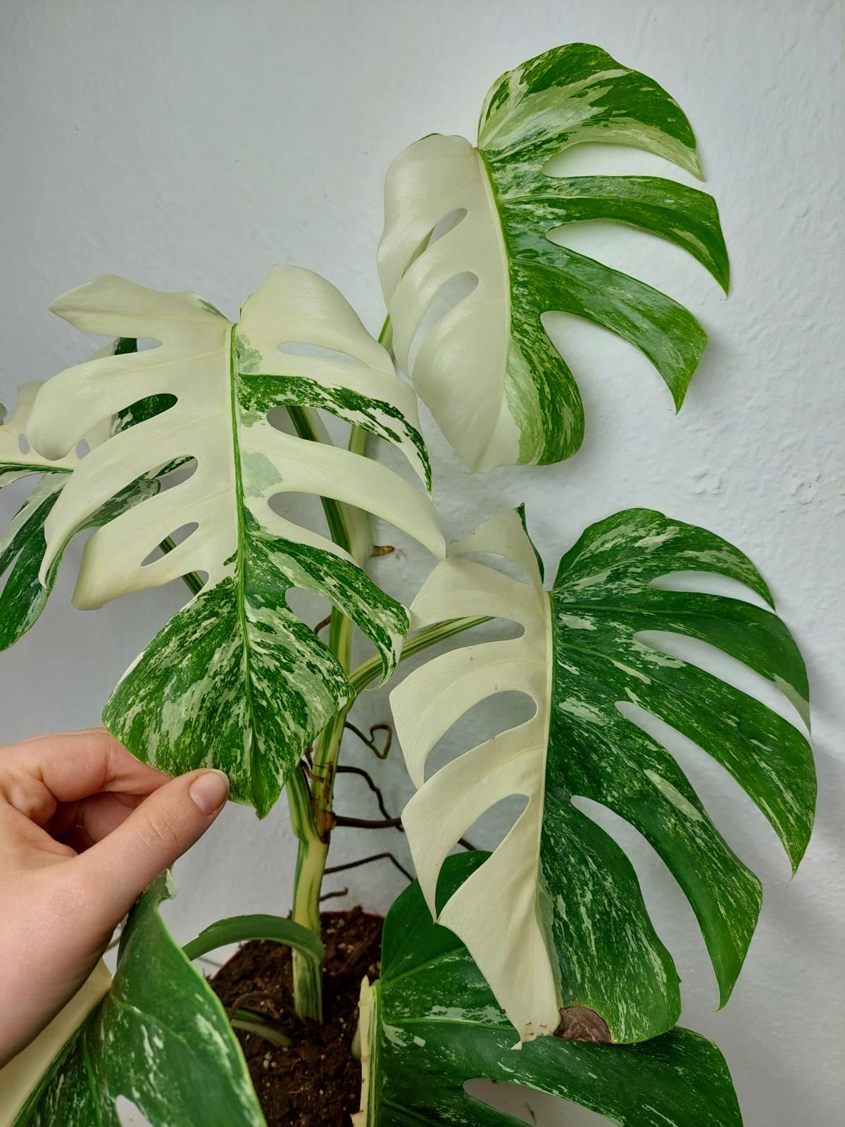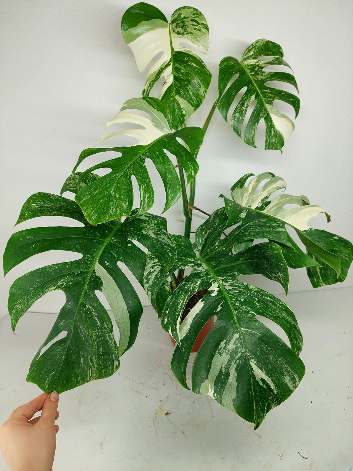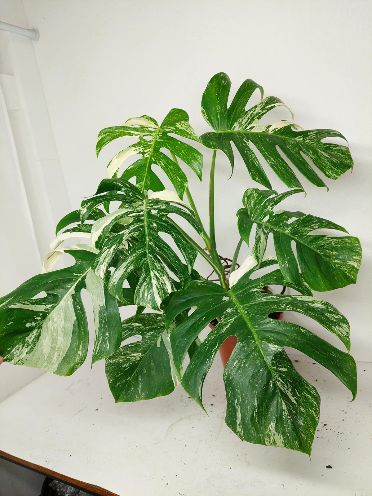 Diese einzigartige Zimmerpflanze ist ein echter Blickfang mit ihrem atemberaubenden Blattmuster. Jedes grüne Blatt ist kunstvoll mit weißer Variegation verziert, was der Pflanze einen ganz besonderen Charme verleiht. Es handelt sich um die Monstera Borsigiana.