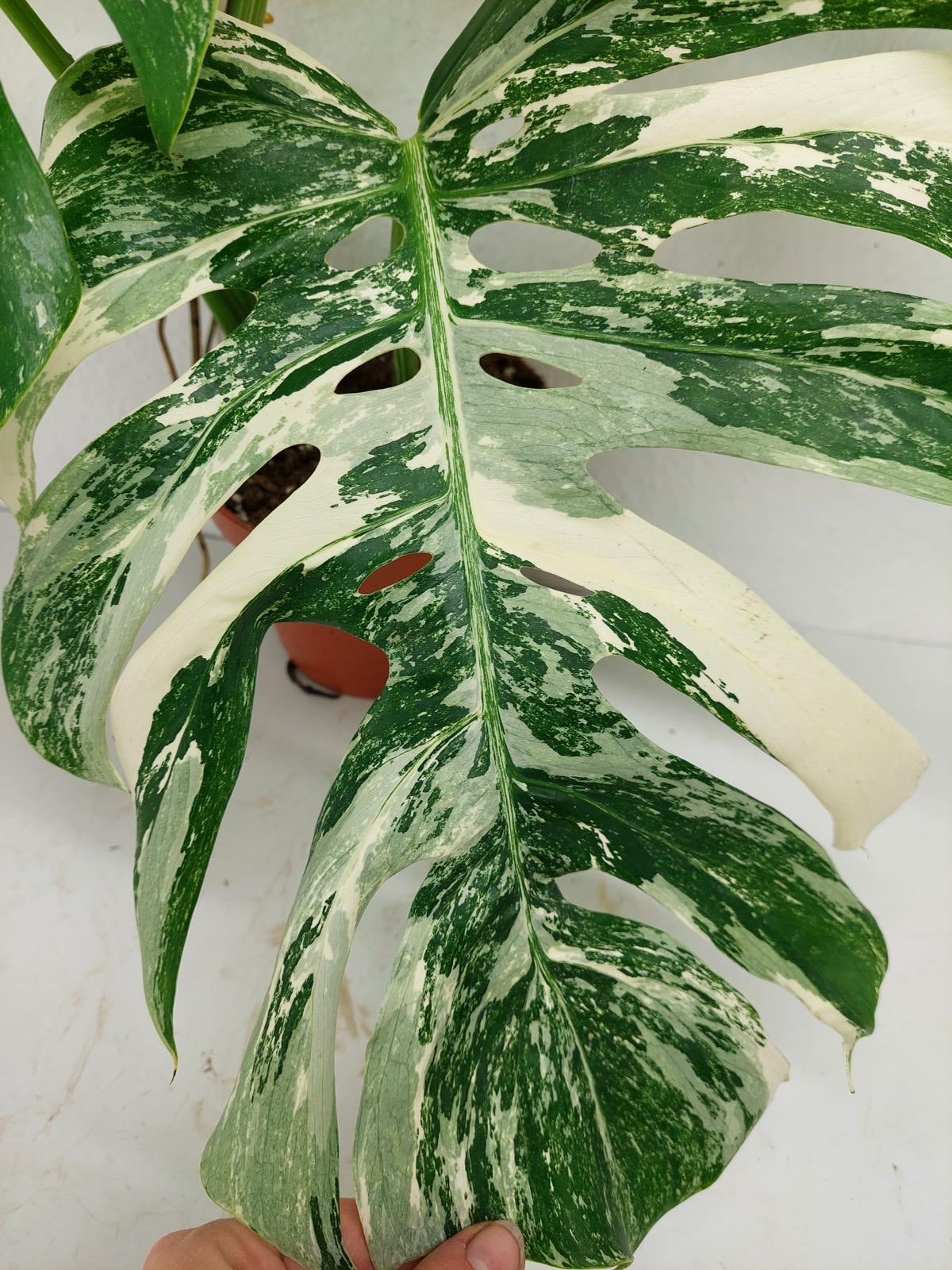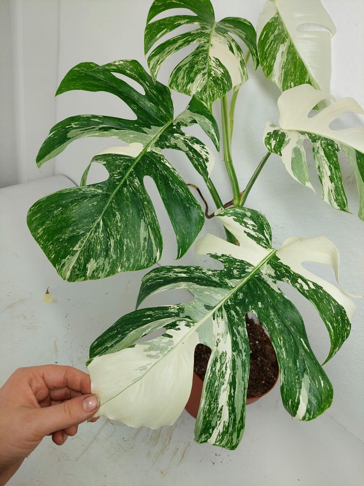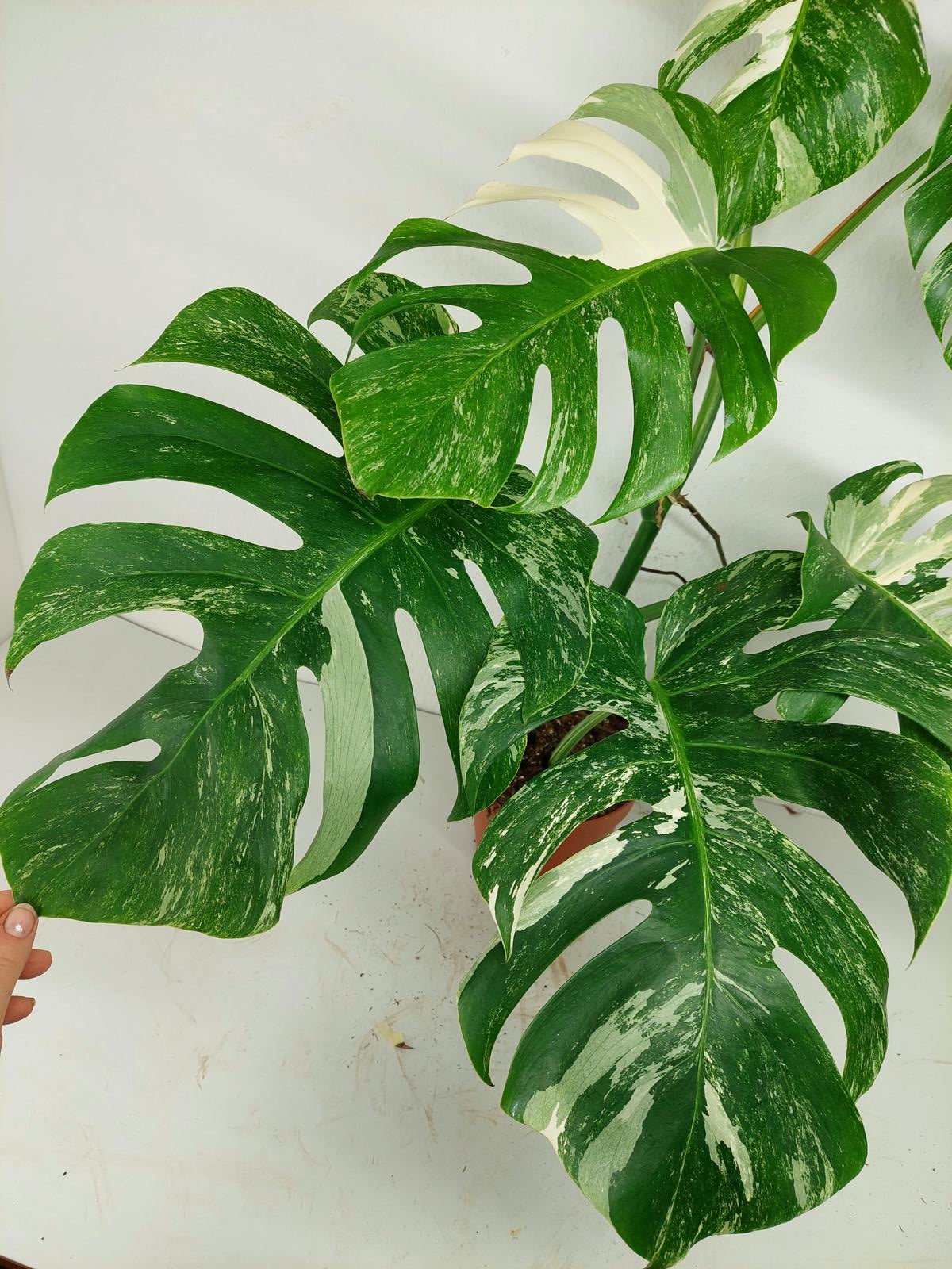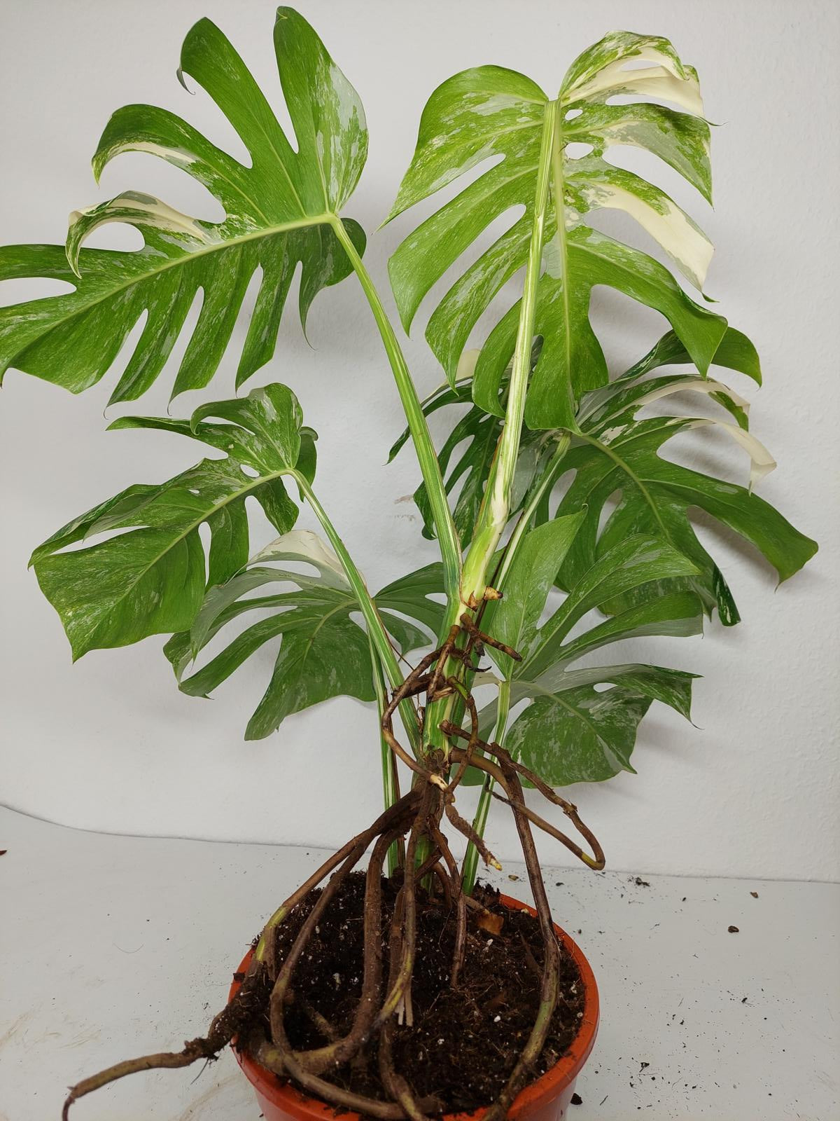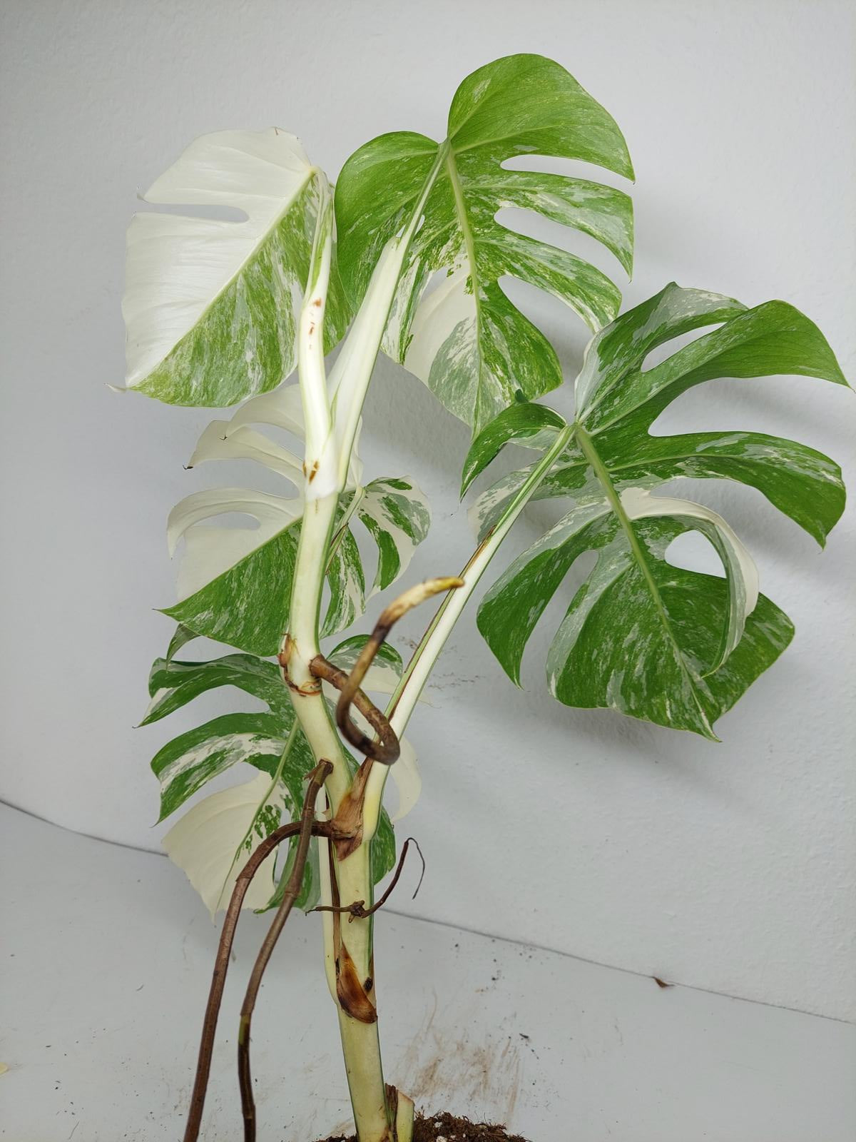 Diese einzigartige Zimmerpflanze ist ein echter Blickfang mit ihrem atemberaubenden Blattmuster. Jedes grüne Blatt ist kunstvoll mit weißer Variegation verziert, was der Pflanze einen ganz besonderen Charme verleiht. Es handelt sich um die Monstera Borsigiana.