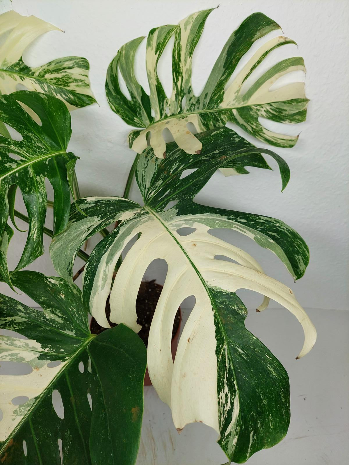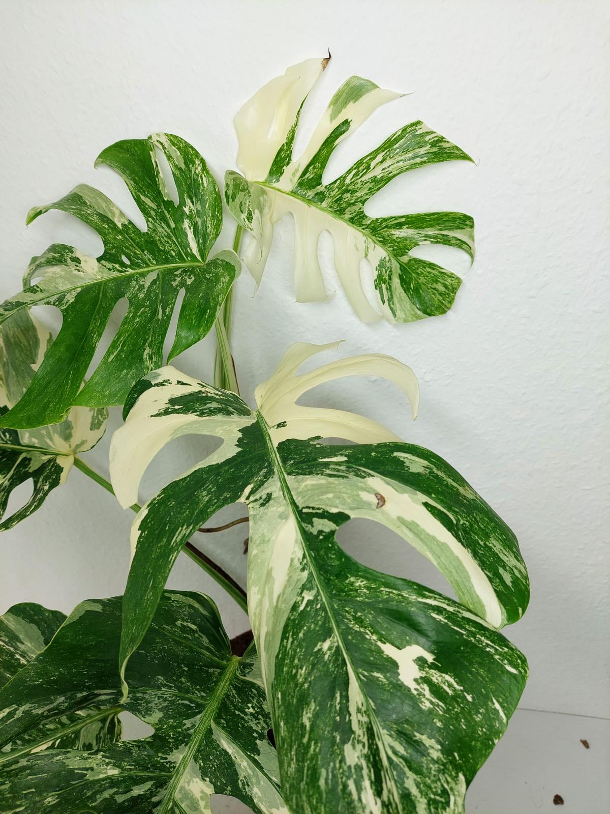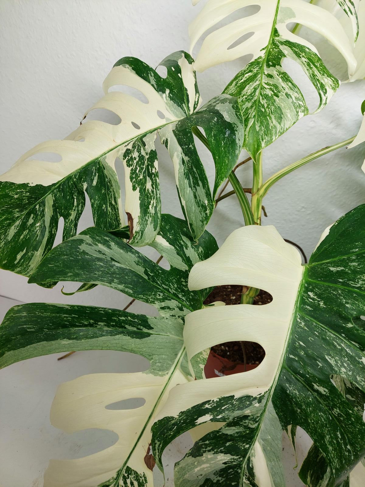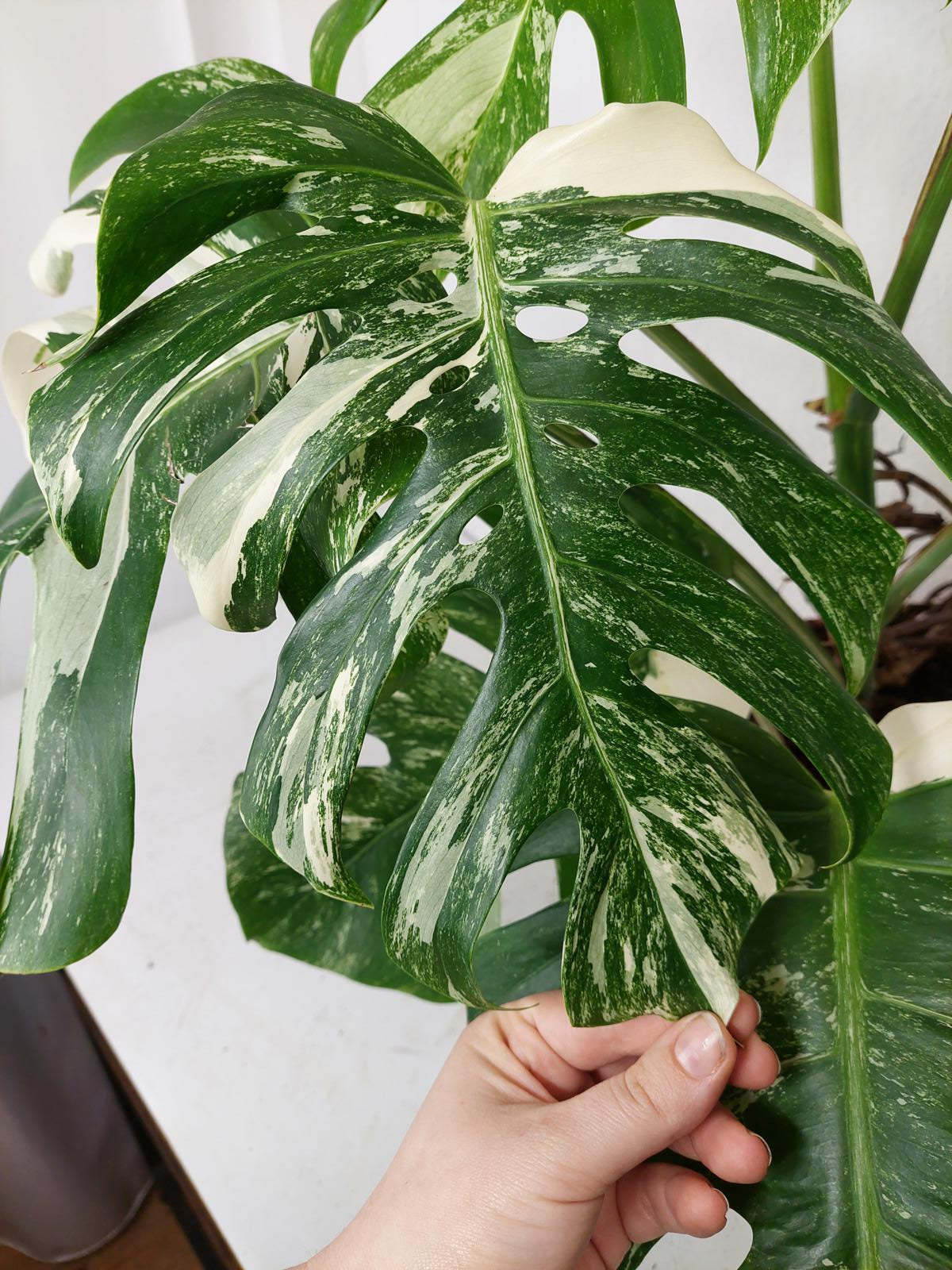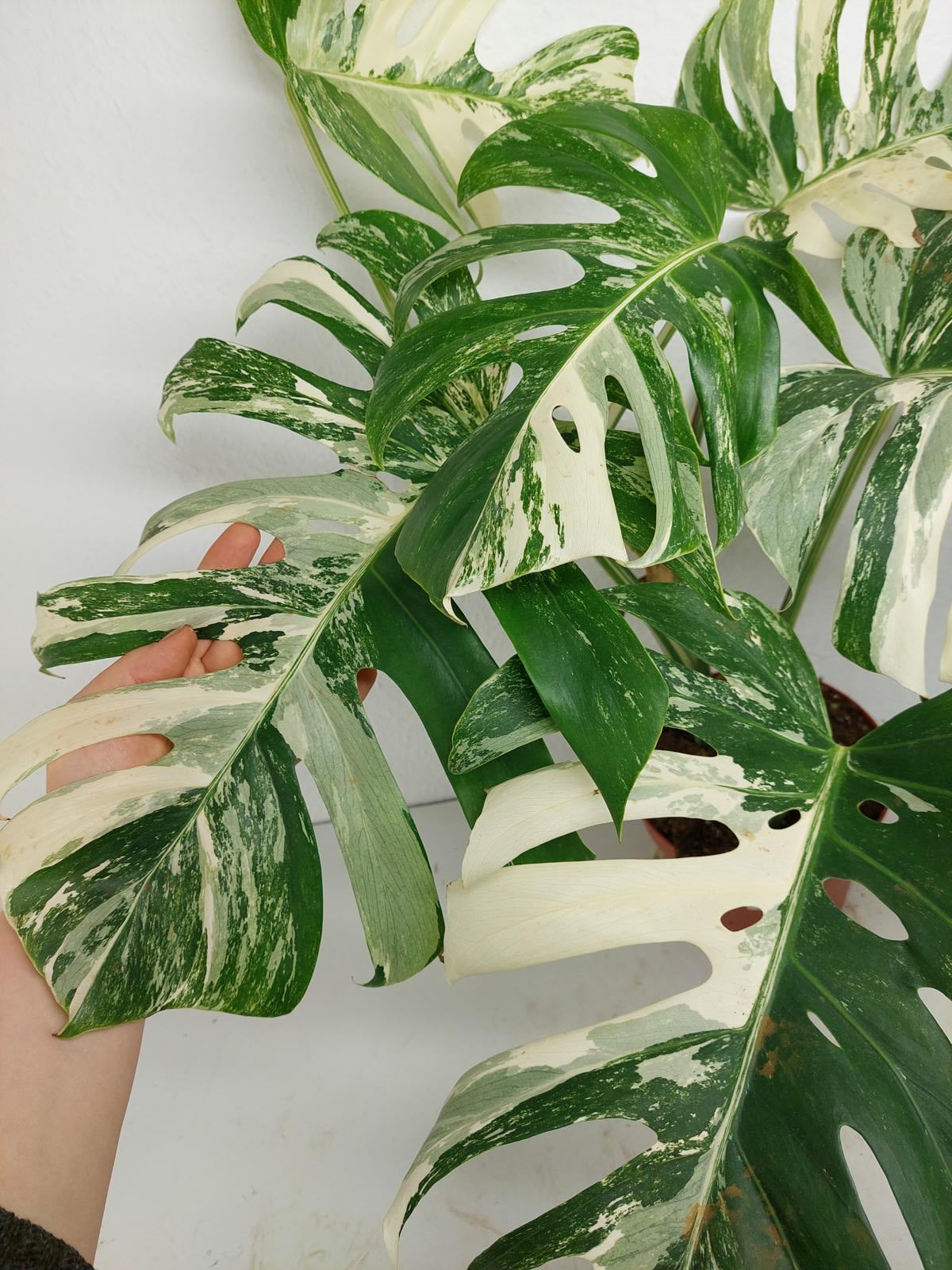Bitte beachte: Es kommt bei Blättern mit viel Panaschierung häufig vor, dass sich die weißen Stellen vor, während oder nach dem Versand braun verfärben! Man kann die Pflanzen mit einem kühleren, aber hellen Standort unterstützen. Sobald die Pflanzen sich eingelebt haben, hört das Braunwerden bei den neuen Blättern auf. Wir können keine Erstattungen für braune Stellen anbieten.