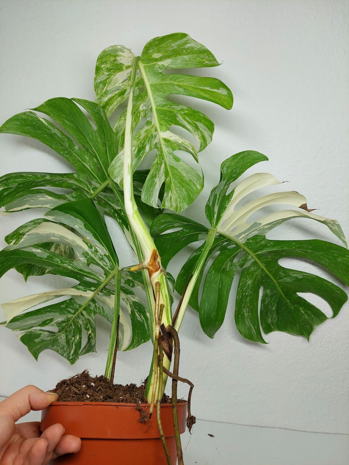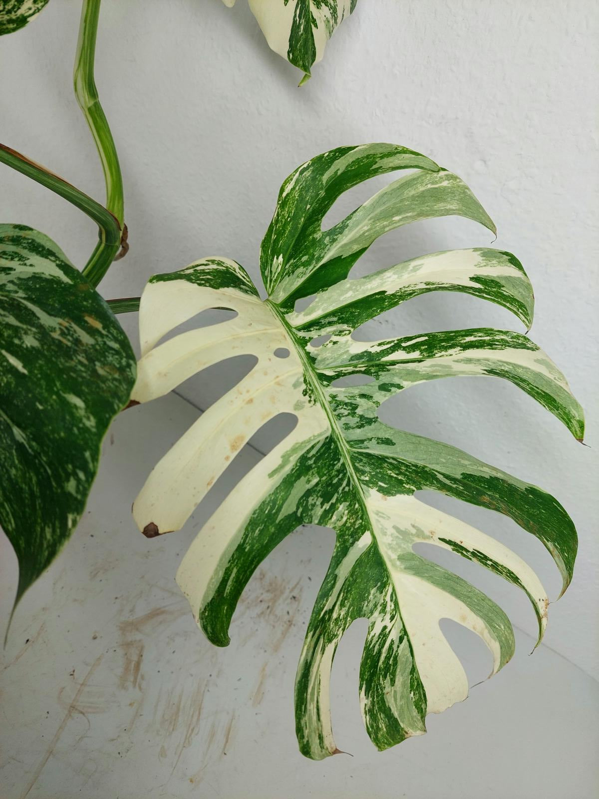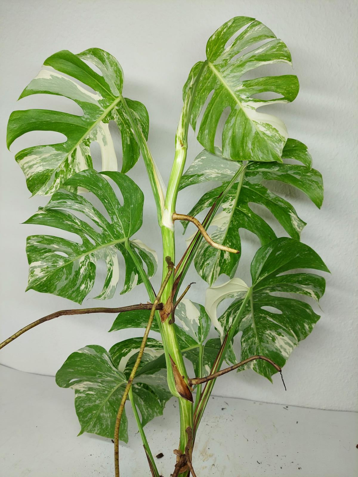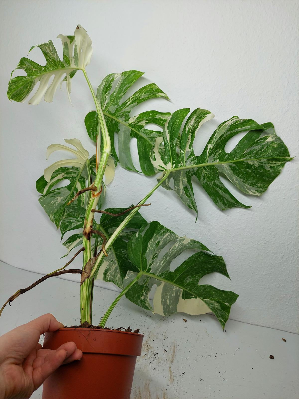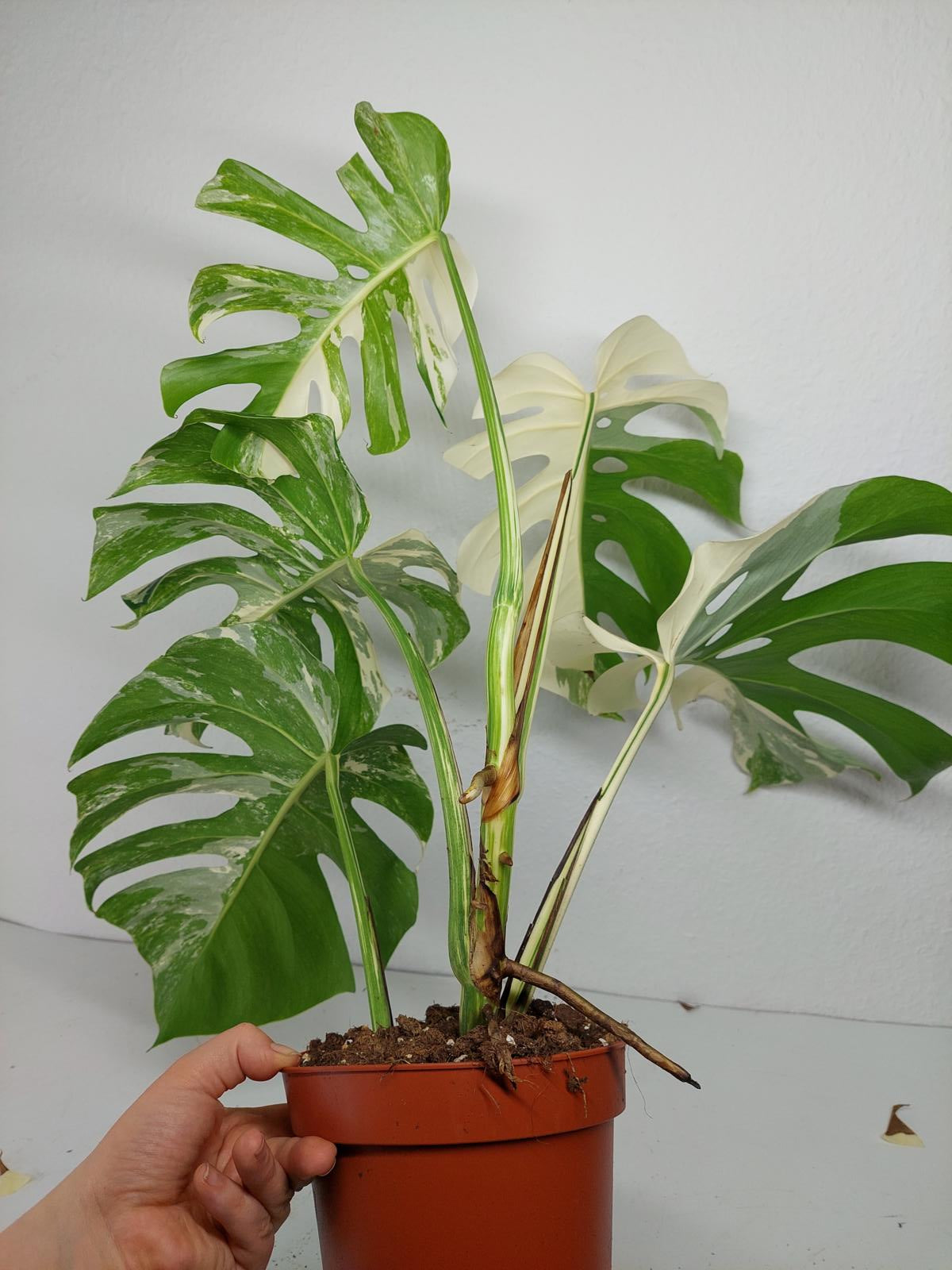 Bitte beachte: Es kommt bei Blättern mit viel Panaschierung häufig vor, dass sich die weißen Stellen vor, während oder nach dem Versand braun verfärben! Man kann die Pflanzen mit einem kühleren, aber hellen Standort unterstützen. Sobald die Pflanzen sich eingelebt haben, hört das Braunwerden bei den neuen Blättern auf. Wir können keine Erstattungen für braune Stellen anbieten.