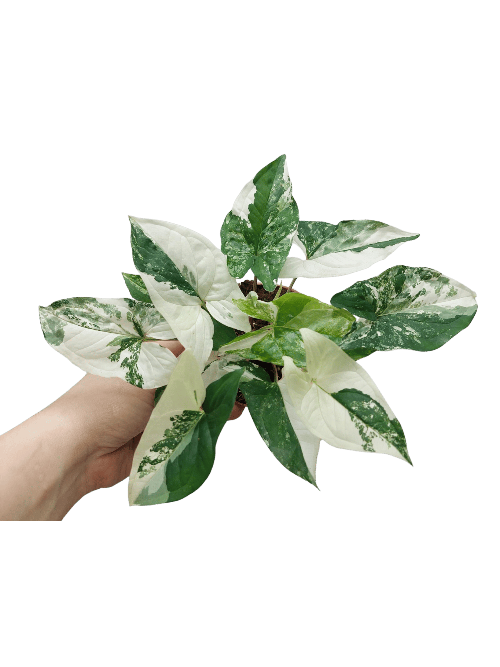 Bei weitem unser Lieblings-Syngonium (Du kannst wahrscheinlich erraten, warum, wenn du dir unseren Namen ansiehst). Diese Rarität ist eine äußerst schöne und belohnende Pflanze. Jedes Blatt entwickelt sich anders und die weiße Variegation kontrastiert schön mit den pfeilförmig geformten, dunkelgrünen Blättern. Es ist erwähnenswert, dass die Syngonium Albo Variegata under den richtigen Bedingungen superschnell wächst und regelmäßig neue Blätter austreibt.